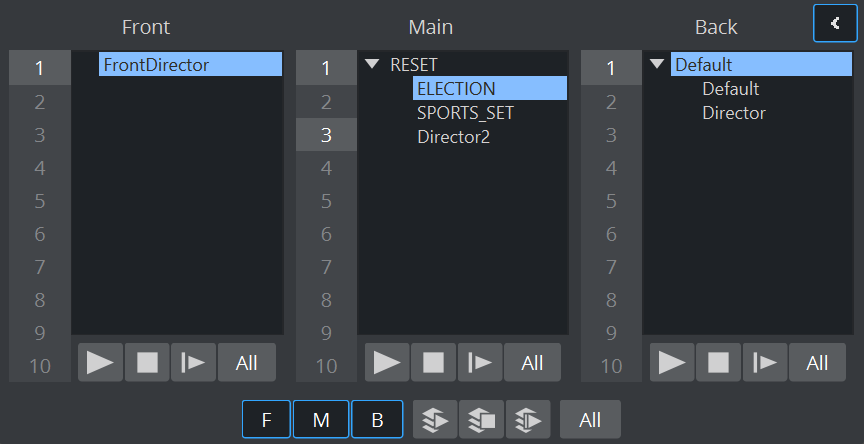 The Director Control Panel window can be used to select and animate one, multiple or all directors in the front, main or back layer. In addition, it can be used to set slots and to animate a combination of director(s).