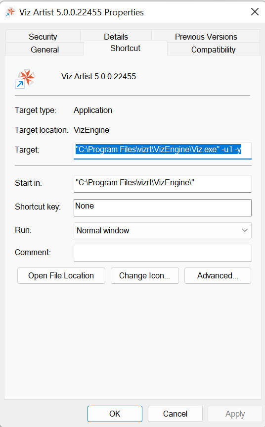 2. In the Properties window, apply a command in the Target field (see Viz Command Line Options).