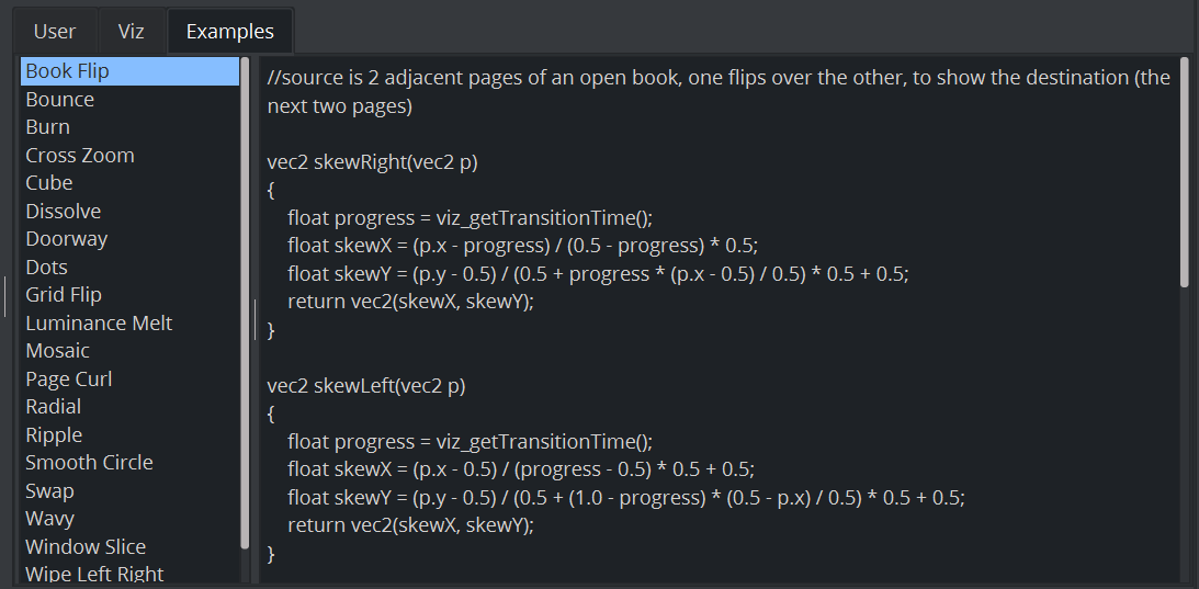 As a starting point, Viz Engine provides some examples for beginners. You can explore them in the Shader Design Environment > Examples, or Transition Shader > Examples tab, depending on the shader type. The following figure shows the transition shader samples: