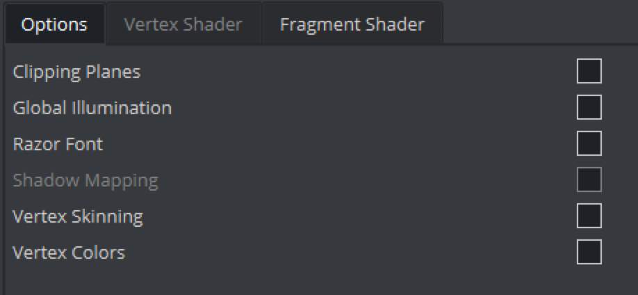Viz Engine Shaders can integrate into Viz Engine design workflows by exposing some parameters to the user. This enables certain built-in render features inside the Viz Engine Shader. These properties can be found in the Options tab.