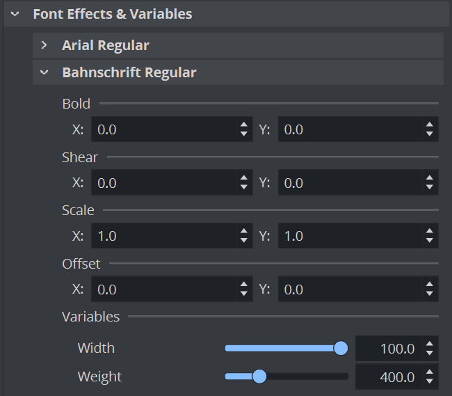 Allows to modify fonts if they for example missing a bold or italic variant. When using variable fonts, some additional properties are shown here. These settings are unique for every single font.