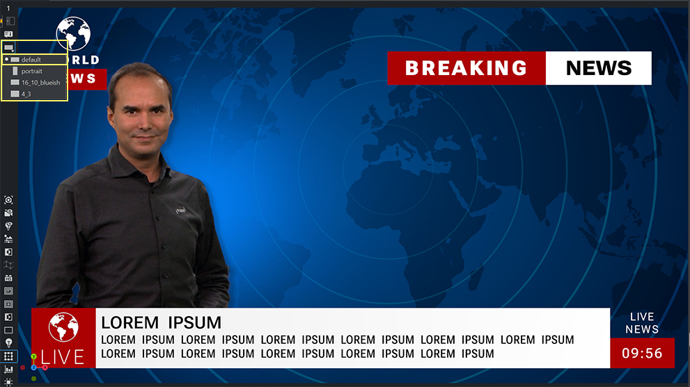 Each scene comes with a default format. This is based on the configured output size (for example, 1920x1080 with an aspect ratio of 1.77) for HD resolution. This is the base and default for all properties. In addition to this format, many additional formats can be added to the scene. These formats can vary in dimension, but do not necessarily. For example, a scene can hold three different HD formats, all in the 1920x1080 dimension, but with different logic and looks.