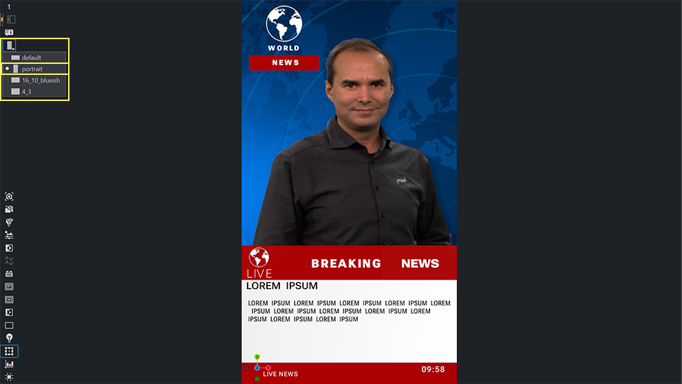 Viz Engine hosts different formats for a single scene, properties of containers, assets and plug-ins and much more are bound to certain formats. This gives anyone the flexibility to create different looks for different formats.