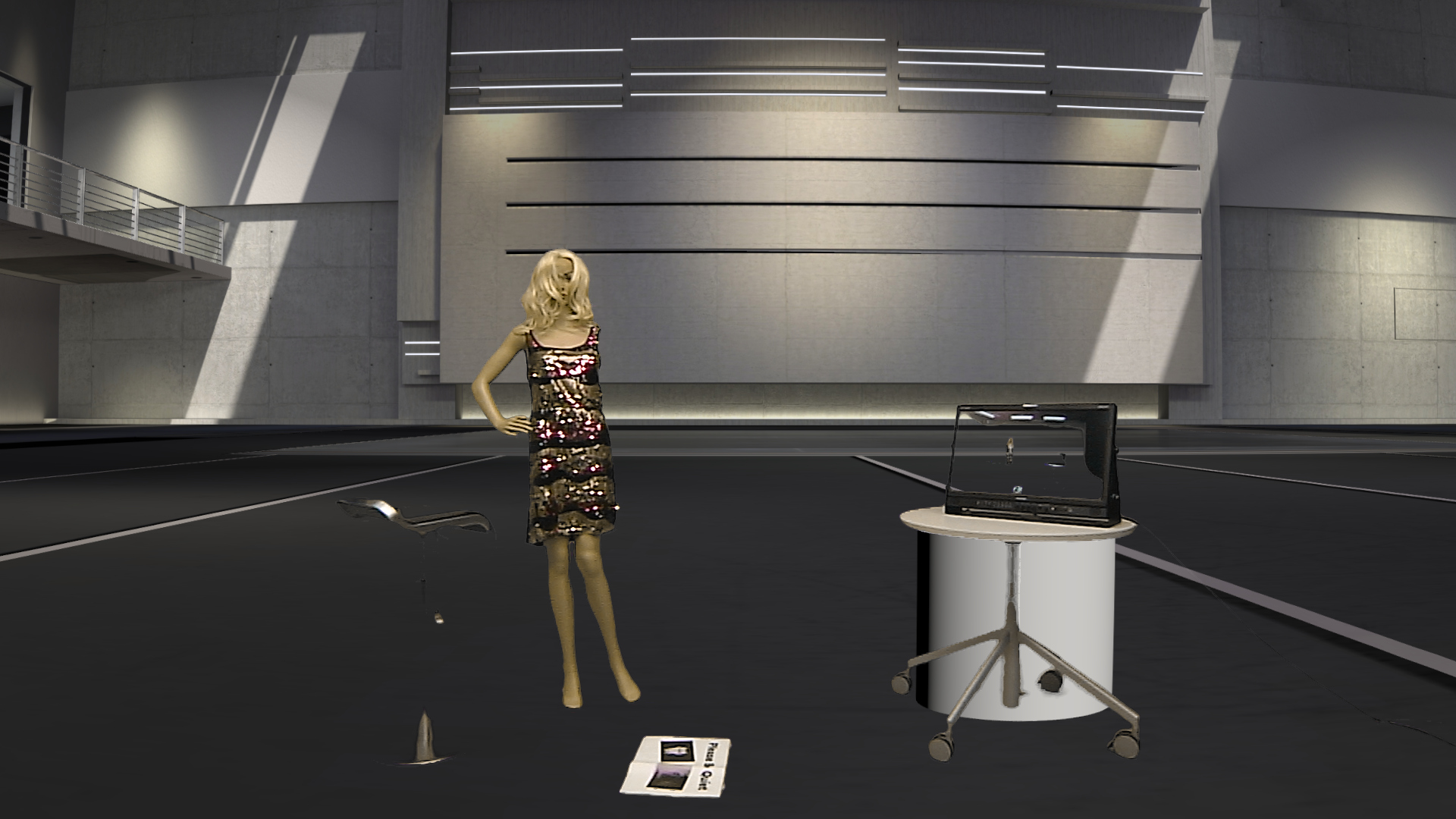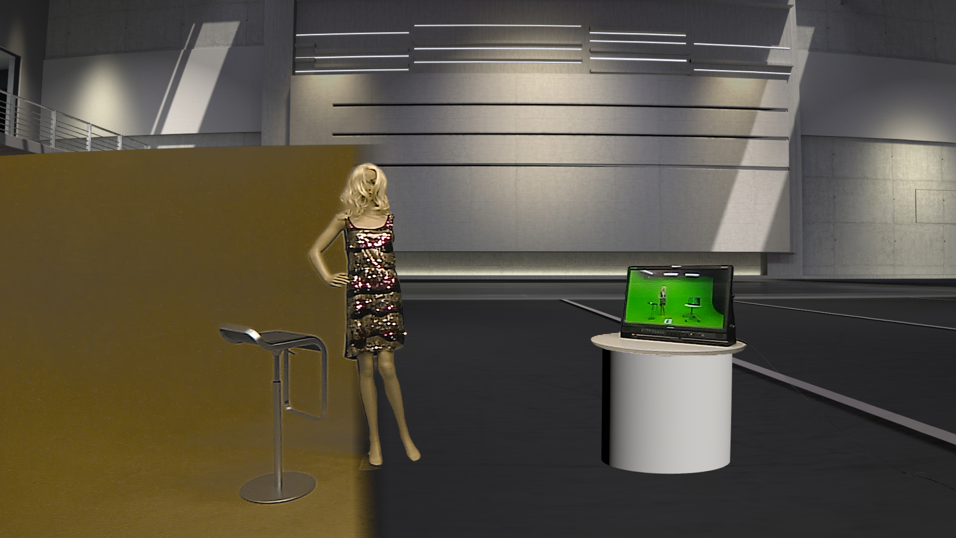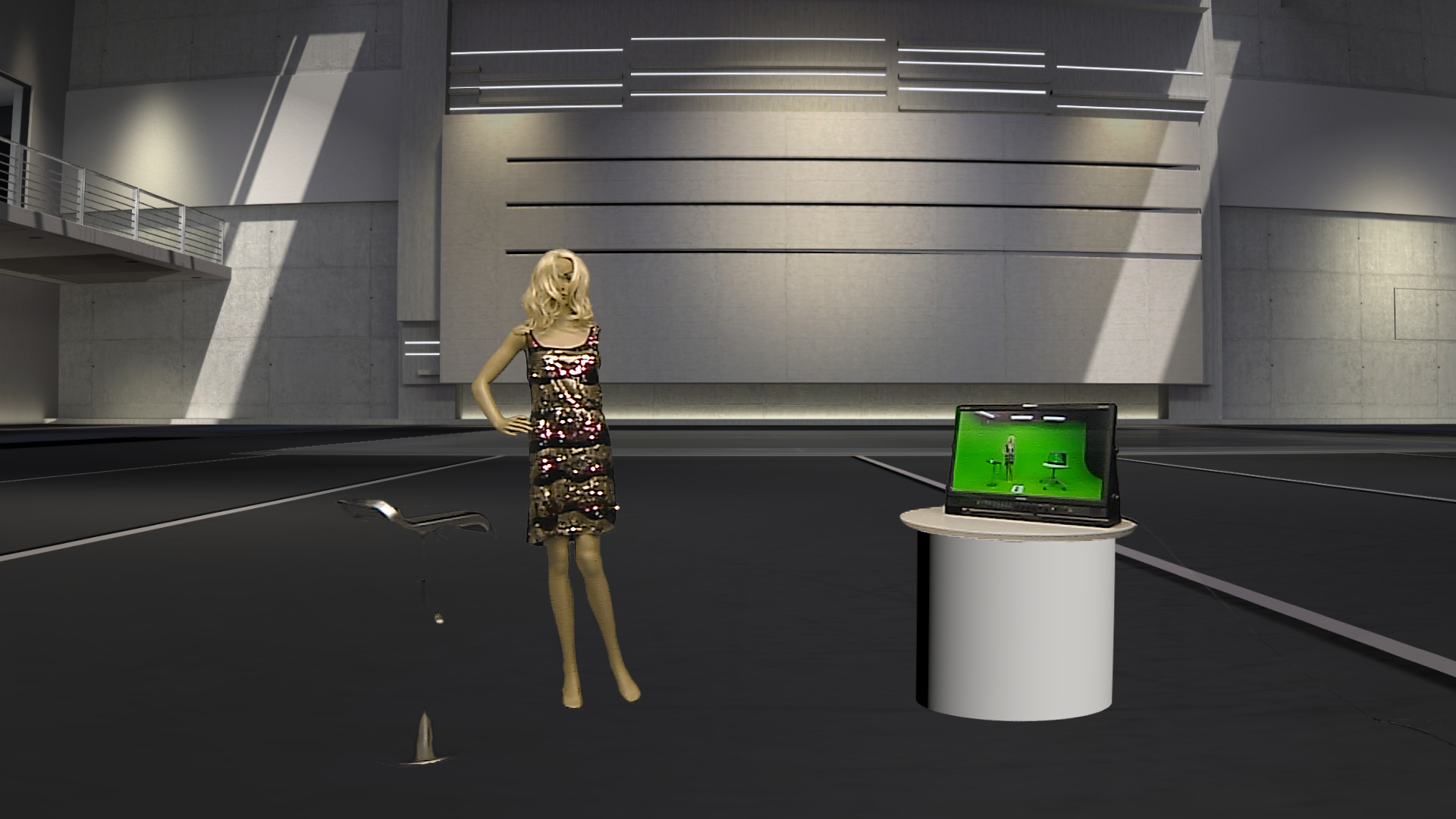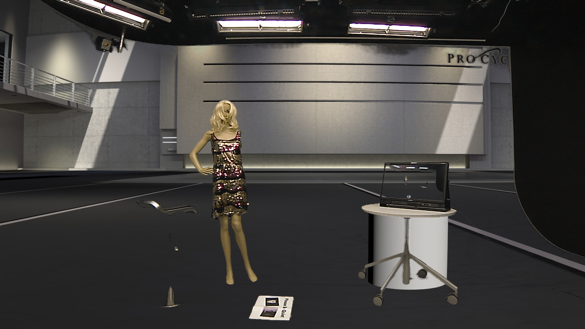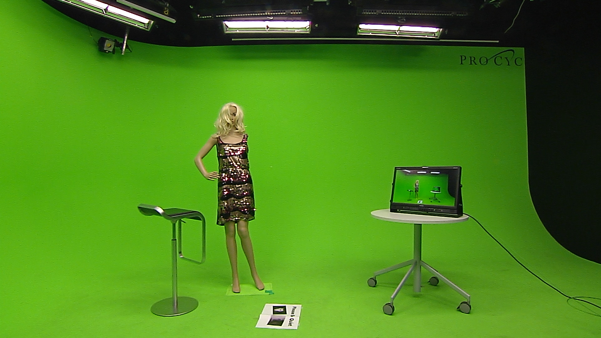 No matte scene used, studio lights and obstacles visible, monitor keyed.