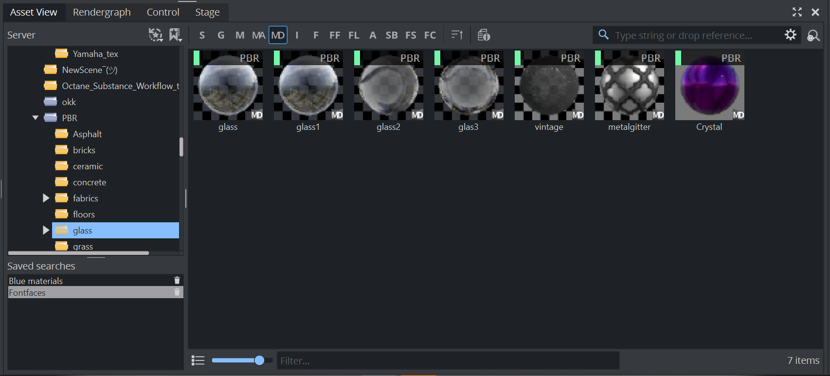 PBR Materials can be stored as Material Definitions on Graphic Hub. This means you can build your own library of pre-defined PBR Materials on your Graphic Hub. To store PBR Materials as Material Definitions, drag and drop them from the Scene Tree to your Server view and give them a proper name. PBR materials are labeled with PBR on top: