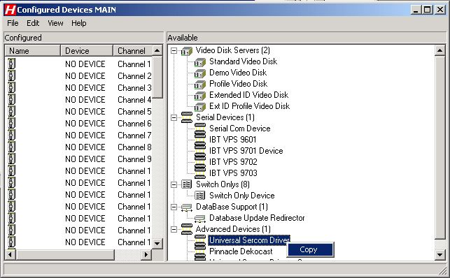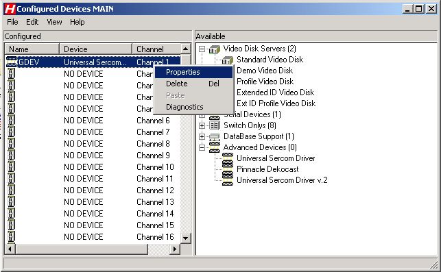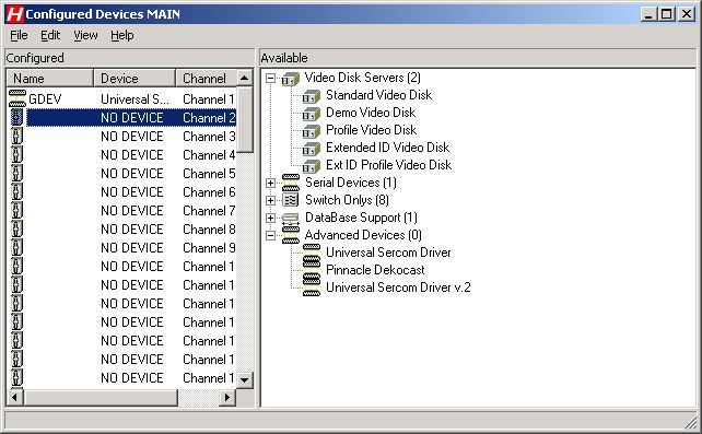 3. In the Available column on the left, locate the Standard Video Disk driver under the Video Disk category. Click and drag the driver to one of the channels on the Configured column that reads NO DEVICE.