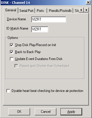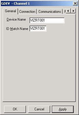 6. In the General tab replace default name and ID with VIZRT001 and click Apply.