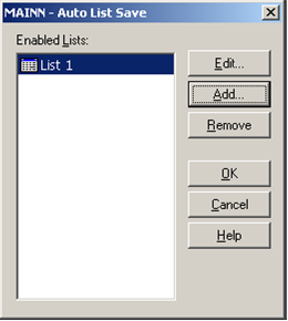1. From the main menu select Properties > Auto List Save. The Auto List Save dialog box is displayed.