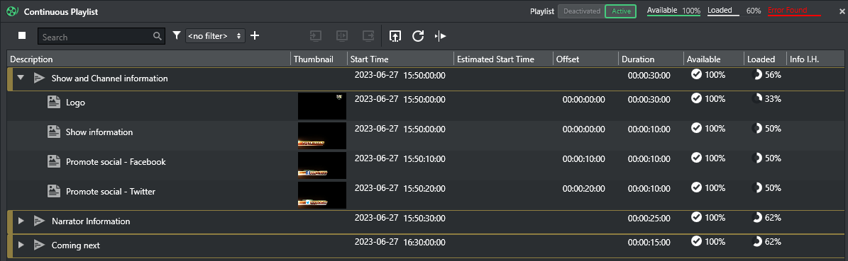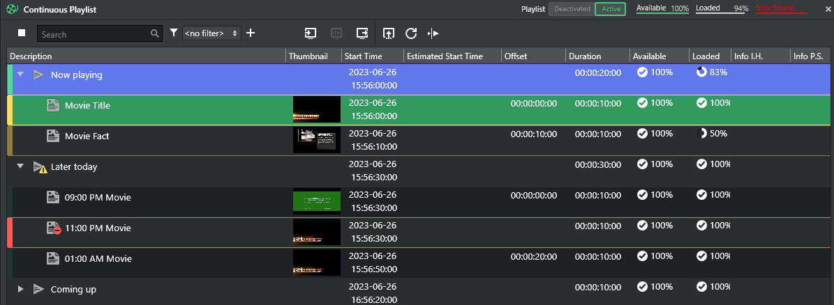 Error | When a channel view and a primary event have red borders, an error is present in a primary that is currently being played out and needs to be addressed urgently. | |