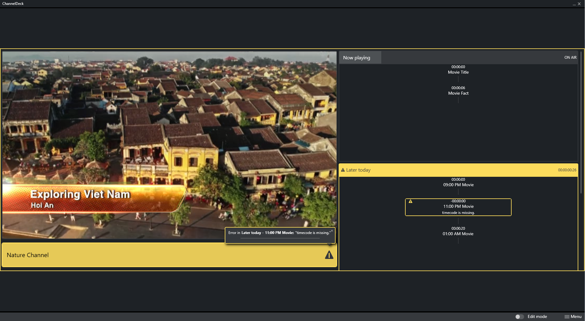Warning | When a channel view and a primary event have yellow borders, it means that primaries that are planned for take or have been played out, contain errors and should be addressed before a take. |