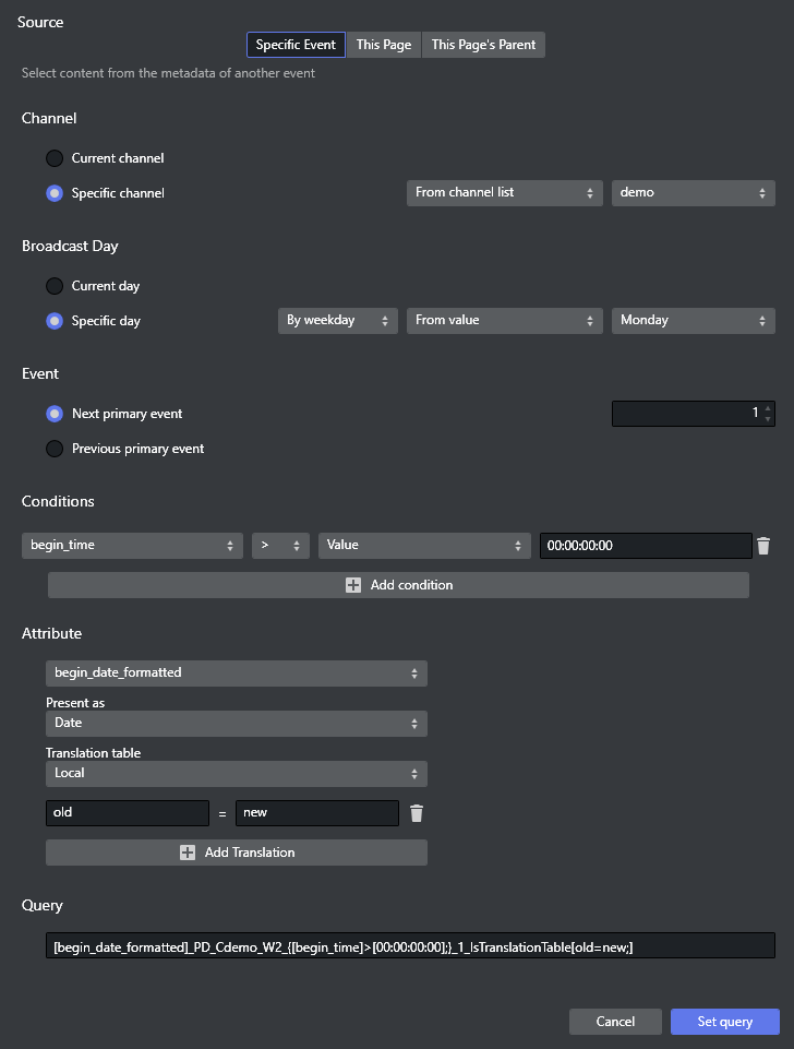 Source: Gets information from a specific event, or the page itself, or the primary event the page resides under. Only the specific event source allows setting the Channel, Broadcast Day, Event and Conditions options.