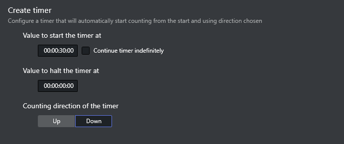The Clock Editor is used to create a timer. It is possible to set the start and halt time for the timer, or let the timer count indefinitely. The timer can be set to count up or count down.