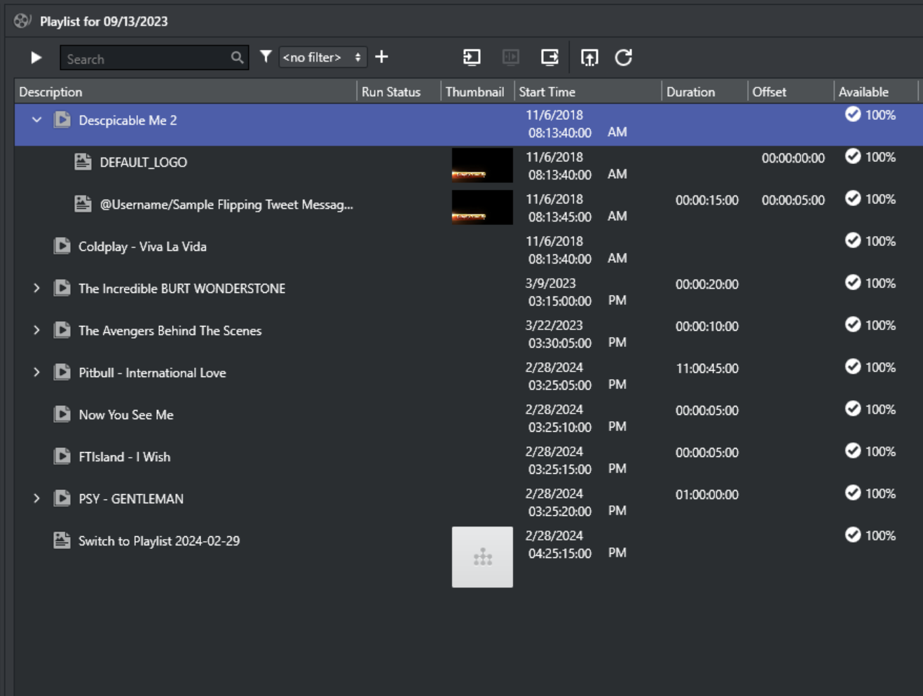 Playlists can be filtered to quickly sort the list of events.