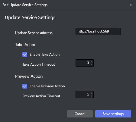 Edit Update Service: A pop-up menu for editing the Update service for the selected template (by setting the Service URL).