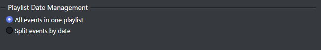 All events in one playlist: Allow only one continuous playlist exist per channel. Regardless of time and on-air date, all events are included in the imported playlist. This setting is recommended.