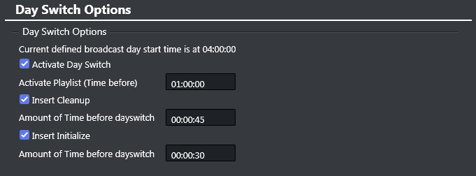 Activate Day Switch: Activates day switch for split playlists. The default Day Switch is 04:00. This can be changed in Channel Settings as required.
