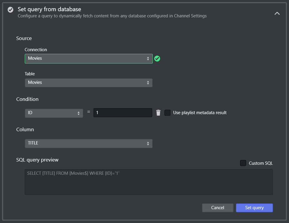 3. Click Set query when query is configured, Promo Server will send back the result if the page is opened from playlist.