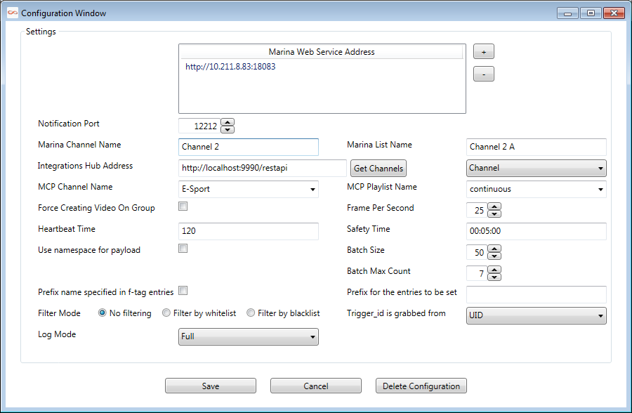 Log Mode | Enable or Disable log messages. Verbosity can be specified as Off (no logs), Basic or Full. Log files will normally be located in %ProgramData%\Vizrt\Viz Channel Branding\Marina Integration. |