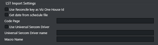 • Universal Sercom Driver name: If left empty, exports Secondary Events as standard secondary events for Harris. If defined, exports secondary events as macro commands for that Universal Sercom Driver (USD) device for Harris (ID=USD_NAME, Title=VIZRT:Media ID, Reconcile Key=Template_name).