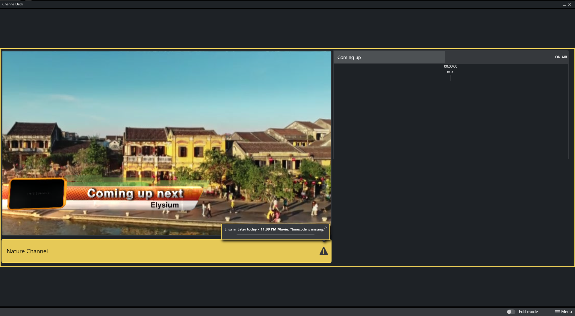 An ON AIR primary, and a planned take of a primary in a warning state with a warning message "Timecode is missing"