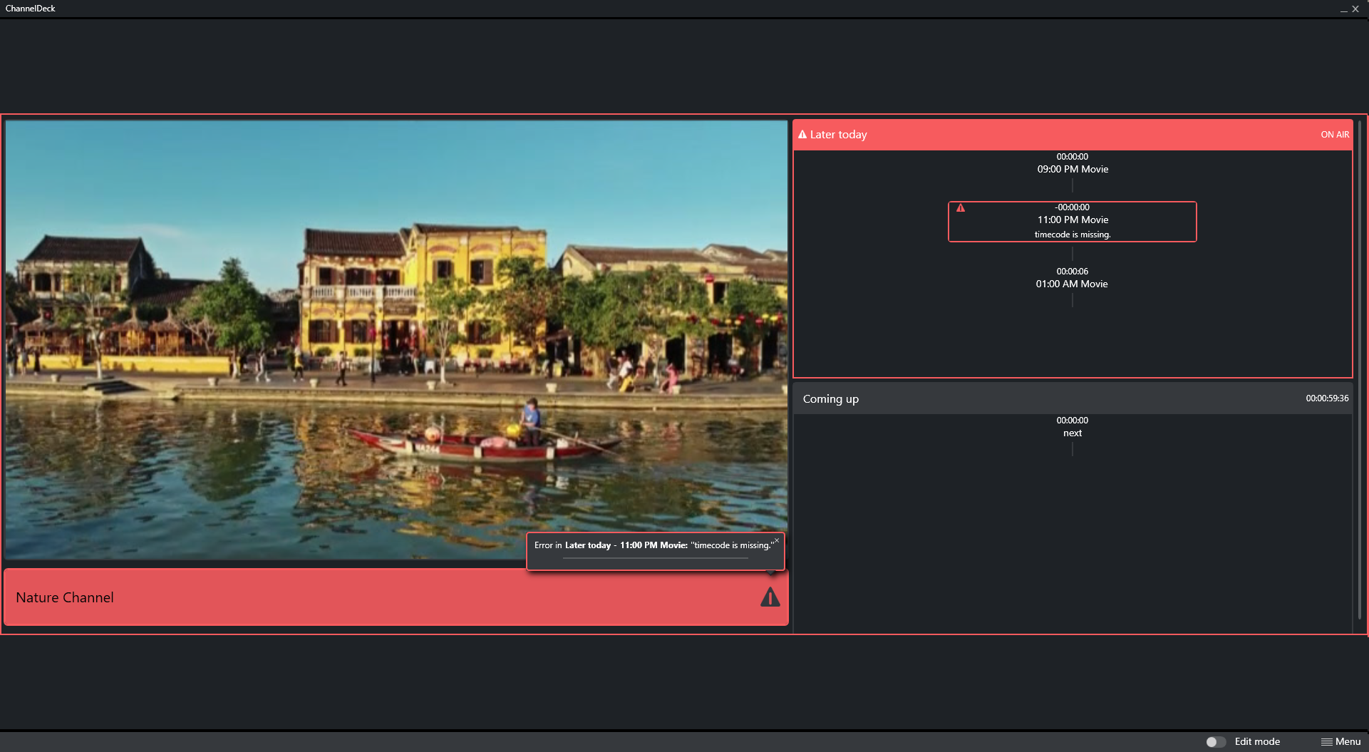 Error | When a channel view and a primary event have red borders, an error is present in a primary that is currently being played out and needs to be addressed urgently. | |