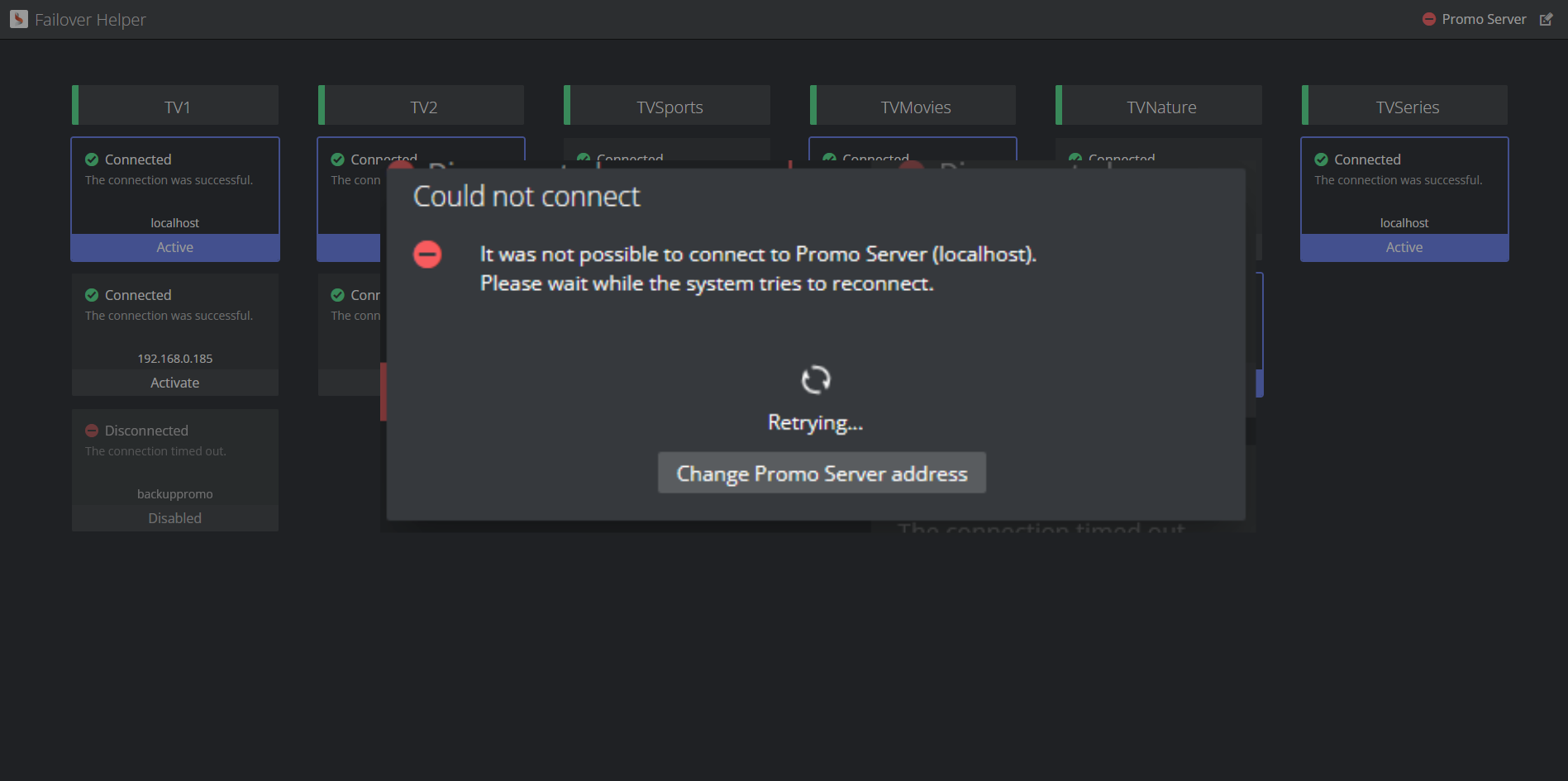 If there is a problem with the connection, a dialog box will lock the application and it will automatically try to reconnect to Promo Server.