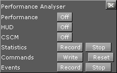 Performance Analyzer: The Performance Analyzer monitors key performance and camera parameters, as a head-up display in the renderer window and initiate logging of statistic, command and event information to log files.