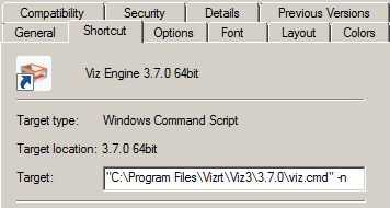 In the Shortcut pane, apply a command in the Target field (see Viz Command Line Options).