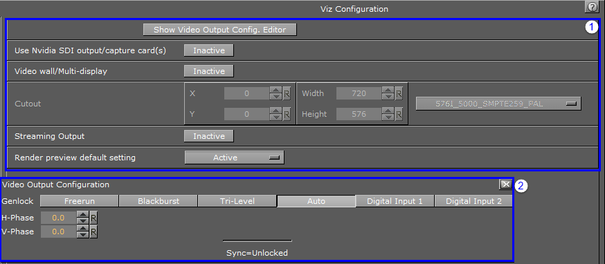 The Video Output Editor defines the synchronization standard and the output signal phases.