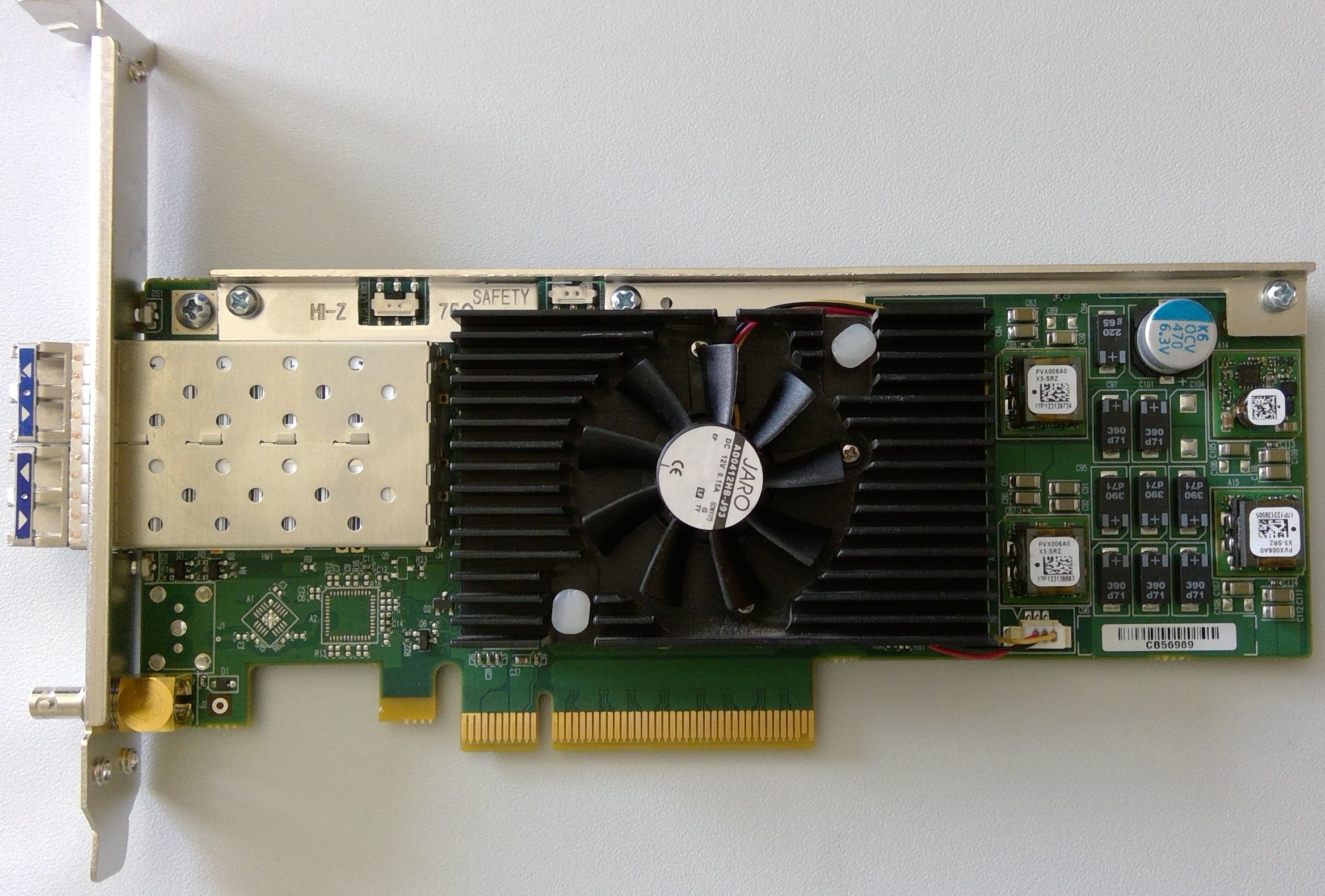 The card contains two enhanced small form-factor pluggable (SFP+) slots, or "bays". In the lower bay is SFP A, and hosts input and output channels 1 through 4. The upper bay houses SFP B, which hosts all of the redundant channels used with SMPTE ST 2022-7. The board does not have any SDI inputs or outputs. There is one Mini-BNC connector used to connect the card to the house genlock signal. However, the card can also be locked to a SMPTE ST 2059 conform time signal, sent via the SFPs.