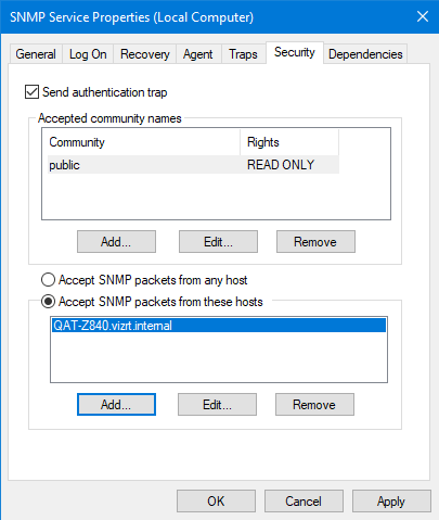 Note: If you want to have active trap notifications, you have to enter the IP destination of your host monitoring system into the trap destinations as the SNMP service forwards the notifications to the monitoring host.