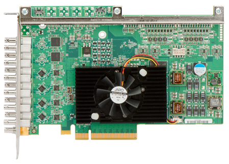 The X.mio3 can be ordered in two configurations: FH (full height, 12 physical HD-BNC connectors, plus one connector for sync) and LP (low profile, eight physical HD-BNC Connectors, plus one connector for sync). Both are half length PCI express Gen2 x8 cards.