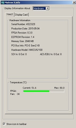 The Matrox X.info utility is used to display information about the card class, how the Input and Outputs are configured, serial number and more. This utility can normally be started from the Windows taskbar. A typical information window would be: