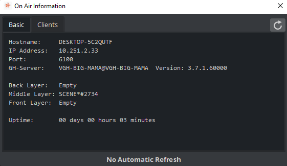 The On Air Information panel shows the required parameters to send external control commands and all connected clients, with the IP address, host name and Viz Port.