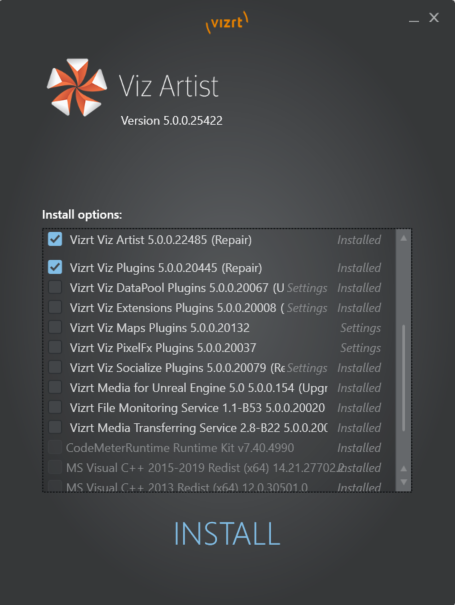 Use the Viz Artist bundle installer to change or reinstall an existing installation. The installer pre-selects any already installed features. Check the boxes for the components that you want to add or remove, then click INSTALL. This reinstalls the complete software suite, repairing any damaged or accidentally deleted files.