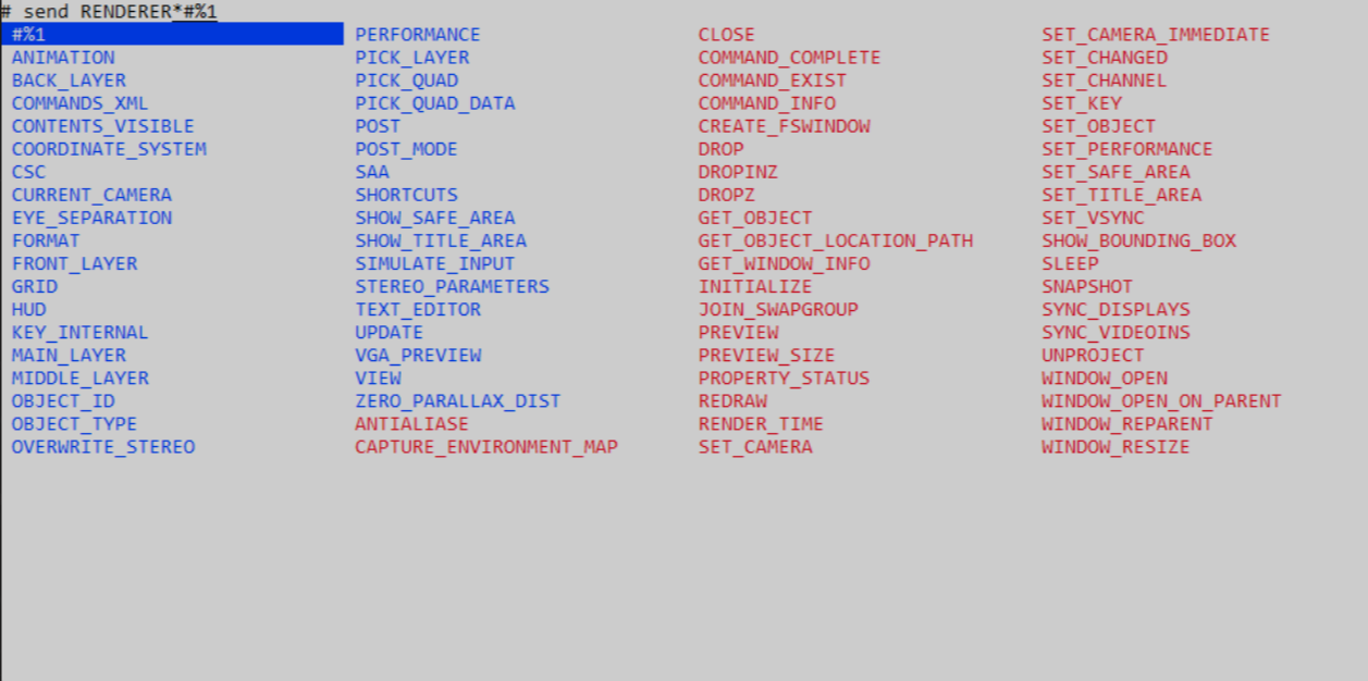 Tip: COMMAND_INFO is a very useful command, used to display help on any other command or subset. For example, passing the command send RENDERER COMMAND_INFO displays a list of all available properties and commands for the RENDERER command, while RENDERER*BACKGROUND displays properties and commands for the BACKGROUND sub-command of the RENDERER command.