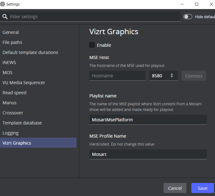 Use the Settings menu to set up Vizrt Graphics.
