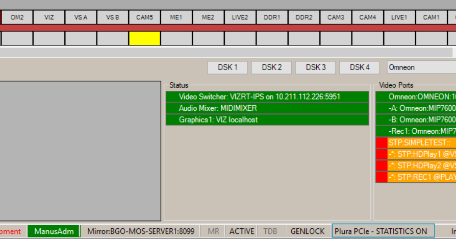 Viz Mosart contains a high resolution internal genlock clock as a built-in safety mechanism which takes care of intermittent or lost external genlock and/or timecode signal.