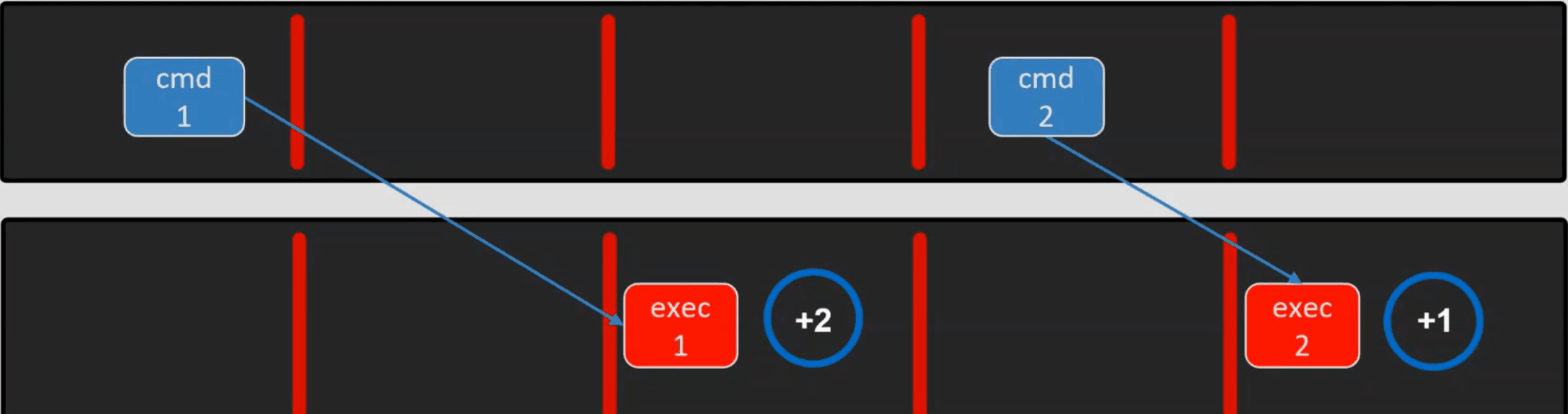 In the figure below, the red bars represent the start of a frame. The outgoing Viz Mosart commands (cmd 1, cmd 2) are now aligned with the start of the frame grid (frame accurate).