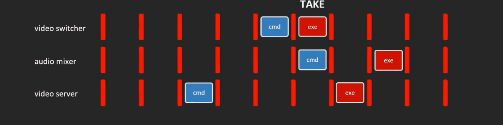 After compensating by executing each command specifically earlier, Viz Mosart can now successfully perform the TAKE command, synchronized for all three devices, from the same frame.