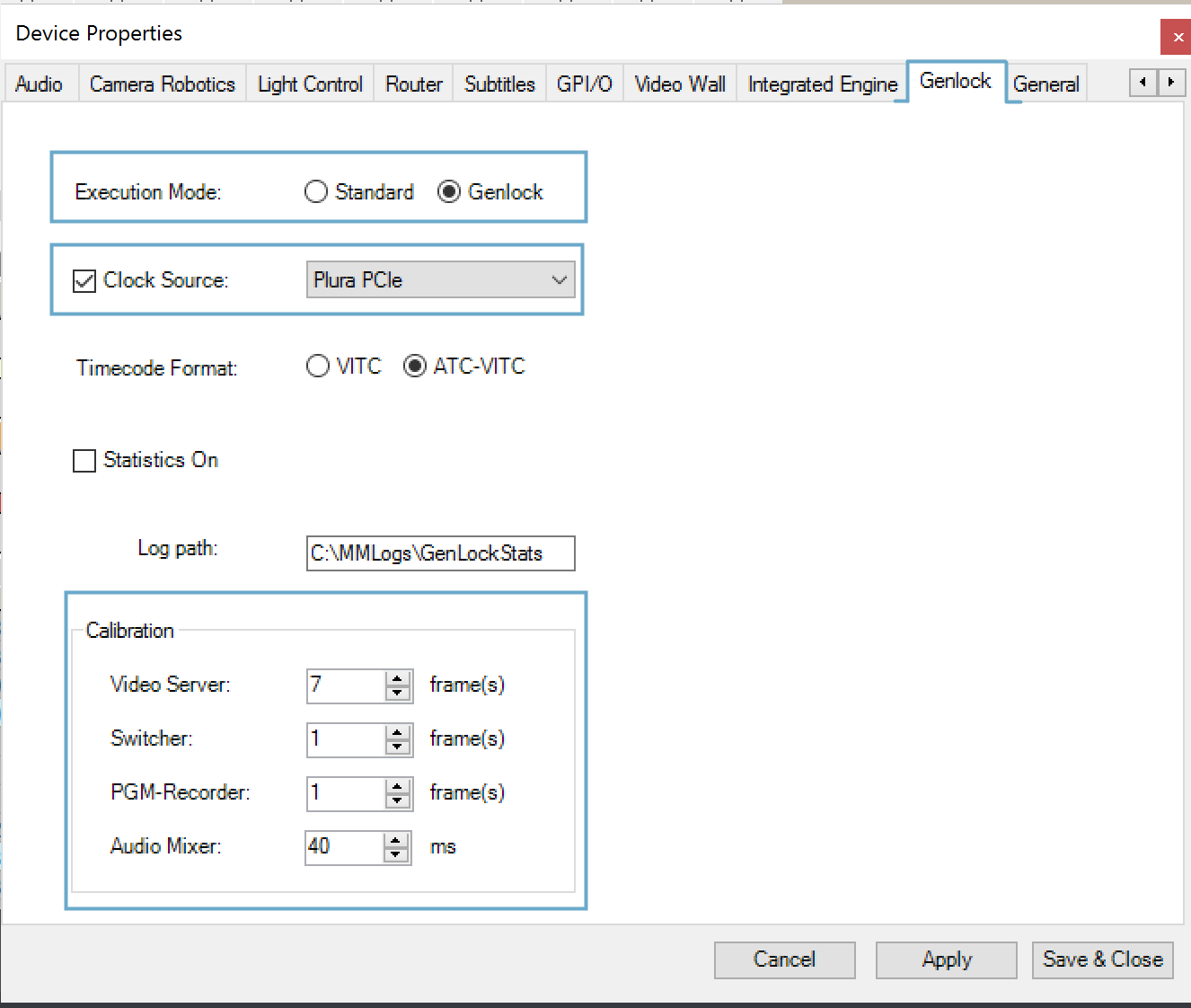 Tip: You can start/stop the clock source statistics by toggling the keyboard shortcut Ctrl+Shift+I directly in AV Automation, without the need to open the Genlock settings tab in the Properties menu.