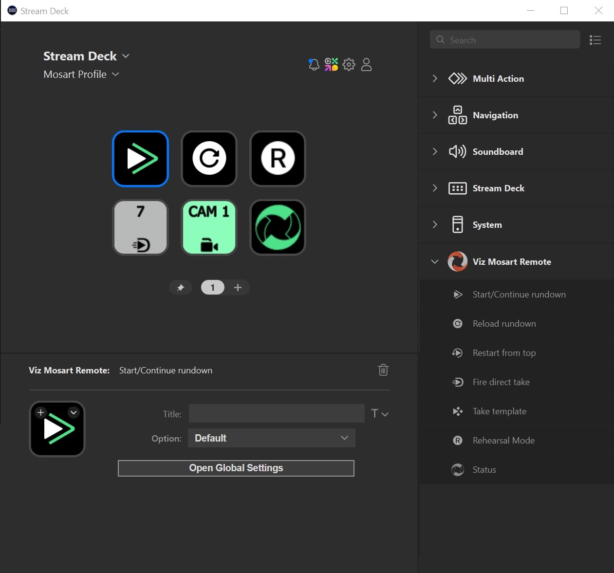 The Elgato Stream Deck plugin for Viz Mosart allows you to trigger various Viz Mosart actions, such as Start/Continue the rundown, Take a template or firing a Direct take.