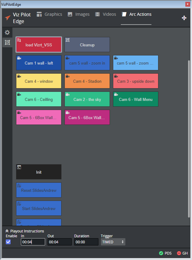 Select a Viz Arc action and enable the Playout Instructions to add timing and the trigger (Timed or Manual).
