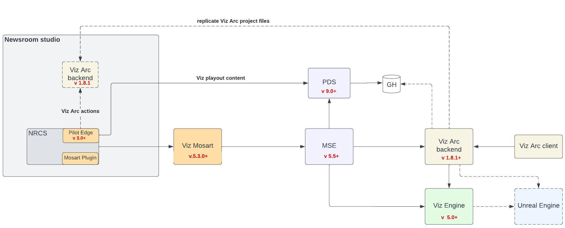The illustration below highlights the main actors and minimum component versions required for configuring Viz Mosart to manage Viz Arc actions within an NRCS-created rundown.