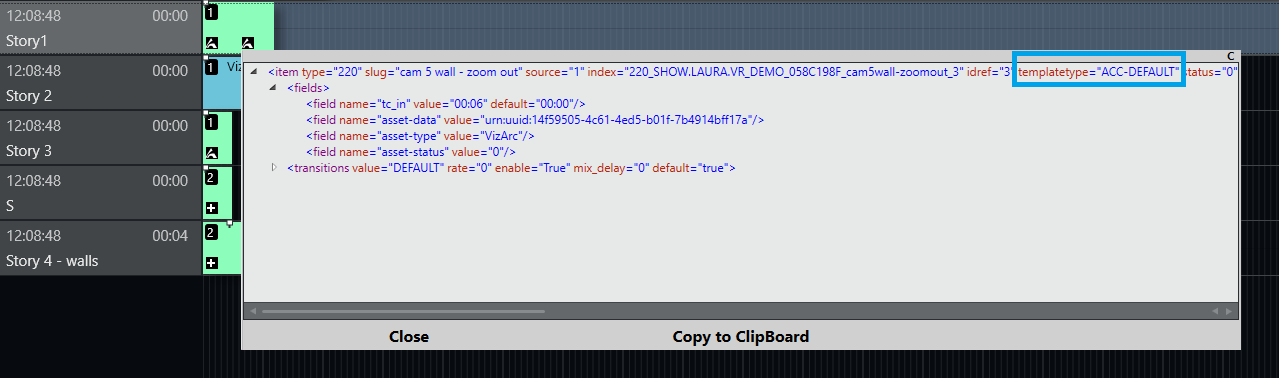 When a rundown containing Viz Arc MOS objects is loaded in Viz Mosart, Mosart parses and attaches the asset data to a default Accessory template: