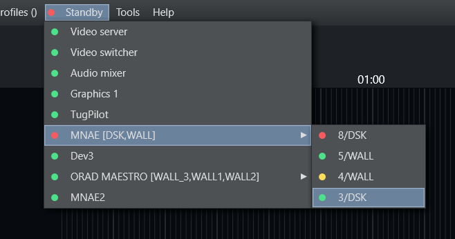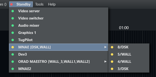 You can set equipment to standby mode from the Viz Mosart UI, AV Automation or the Mosart Overlay Graphics Interface controllers and engines.