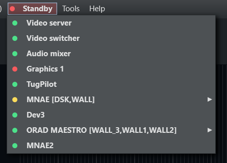 In Mosart GUI, the color in the Standby menu bar changes if any of the AV Automation devices, OGI controllers, OGI Engines are not green.