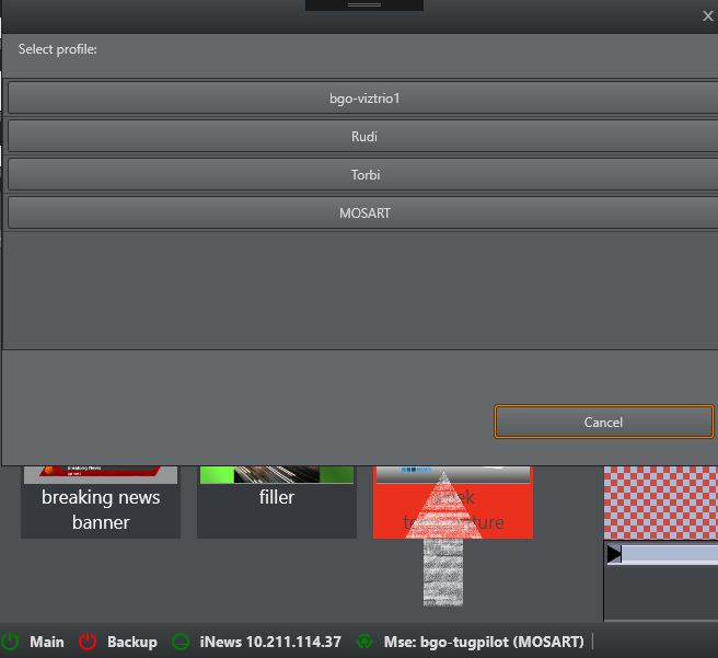 Each thumbnail behaves as a toggle switch, by clicking the thumbnail you set items from an MSE playlist on and off air to a Viz Engine.