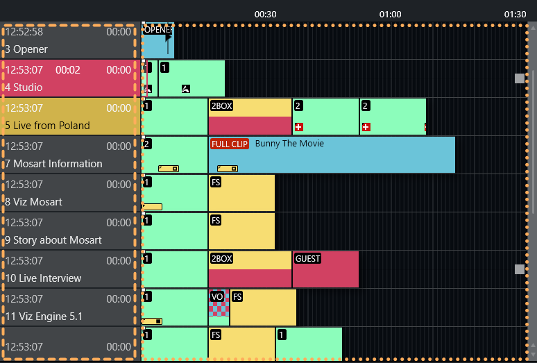 Each story row comprises color coded items and sub-items presented chronologically on a timeline. The colors correspond to the Viz Mosart templates that have been pre-programed to execute each operation, when taken.