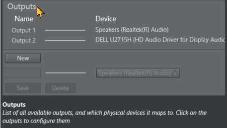 The Name column shows all outputs. The Device column shows all available playback devices on the computer.